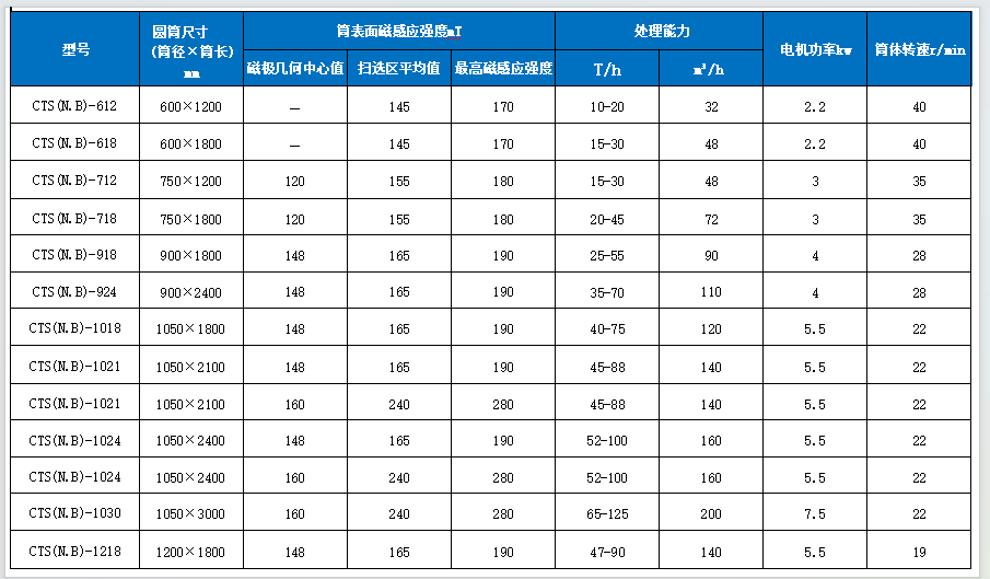 4.根据不同的用途和分选条件,各系列磁选机具有不同的磁系设计和槽体结构;