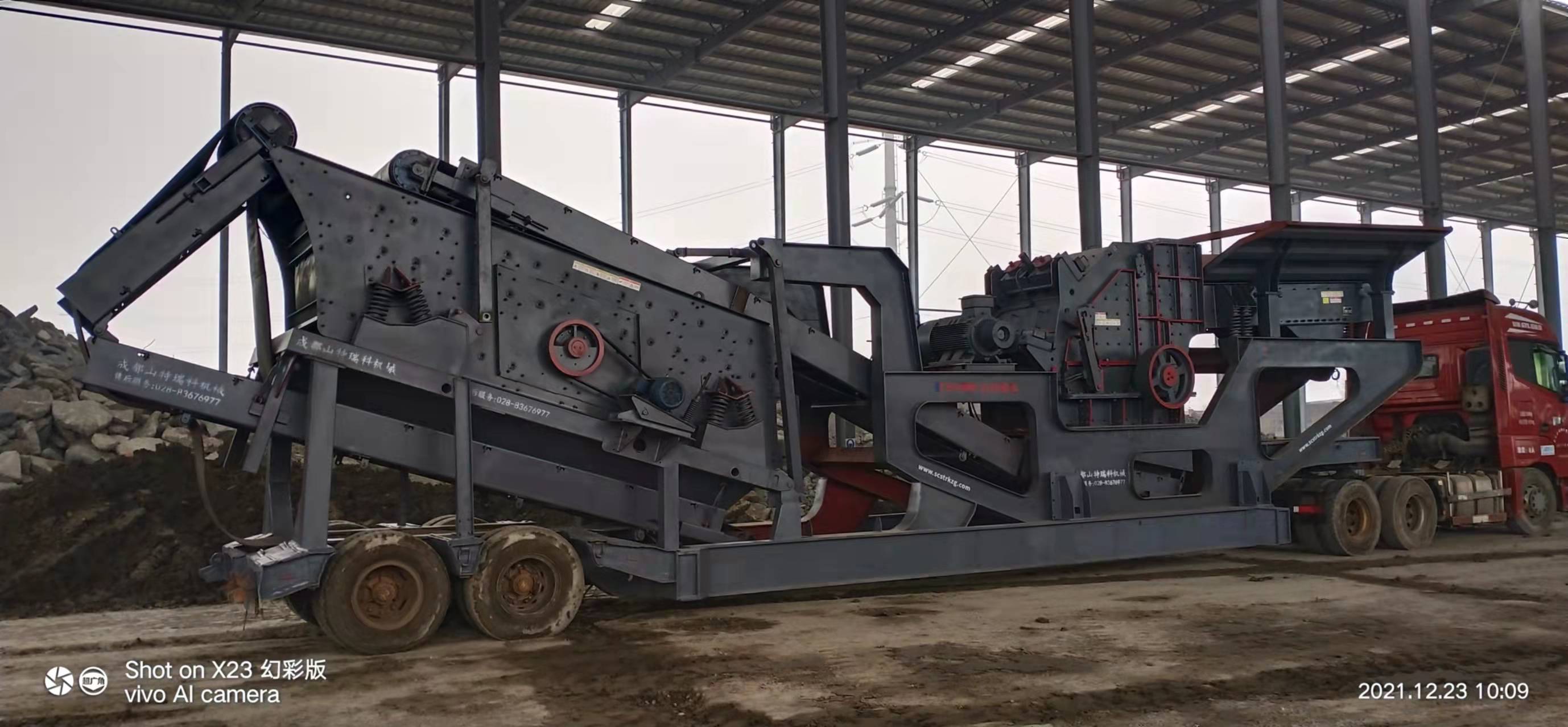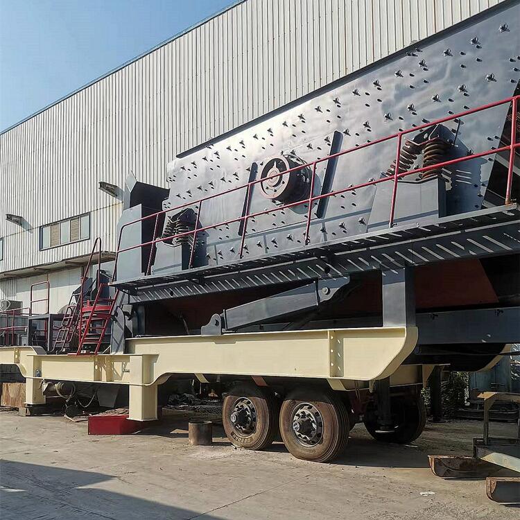 轮胎移动站由车架总成、车体汽配组件、主机及辅助设备、动力系统和液压电控系统组成。移动时。通过挂车提供牵引力拖动车架。依靠车架自身的轮胎辅助行走。安装时,依靠外接电力,通过液压电控系统控制液压缸等助作。完成设备安装;工作时,依靠外接电力驱动主机及辅助设备电机,带动设备工作,物料从料仓或皮带机进入主机碳碎或筛分后,通过皮带机排出.
