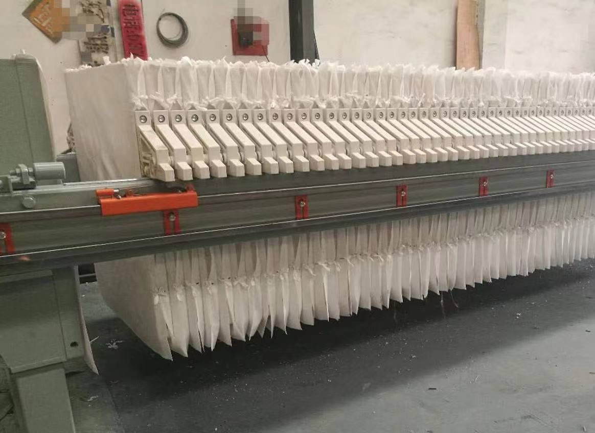 板、框两侧各有把手支托在横梁上,由压紧装置压紧板、框。板、框之间的滤布起密封垫片的作用。由供料泵将悬浮液压入滤室在滤布上形成滤渣,直至充满滤室。滤液穿过滤布并沿滤板沟槽流至板框边角通道,集中排出。