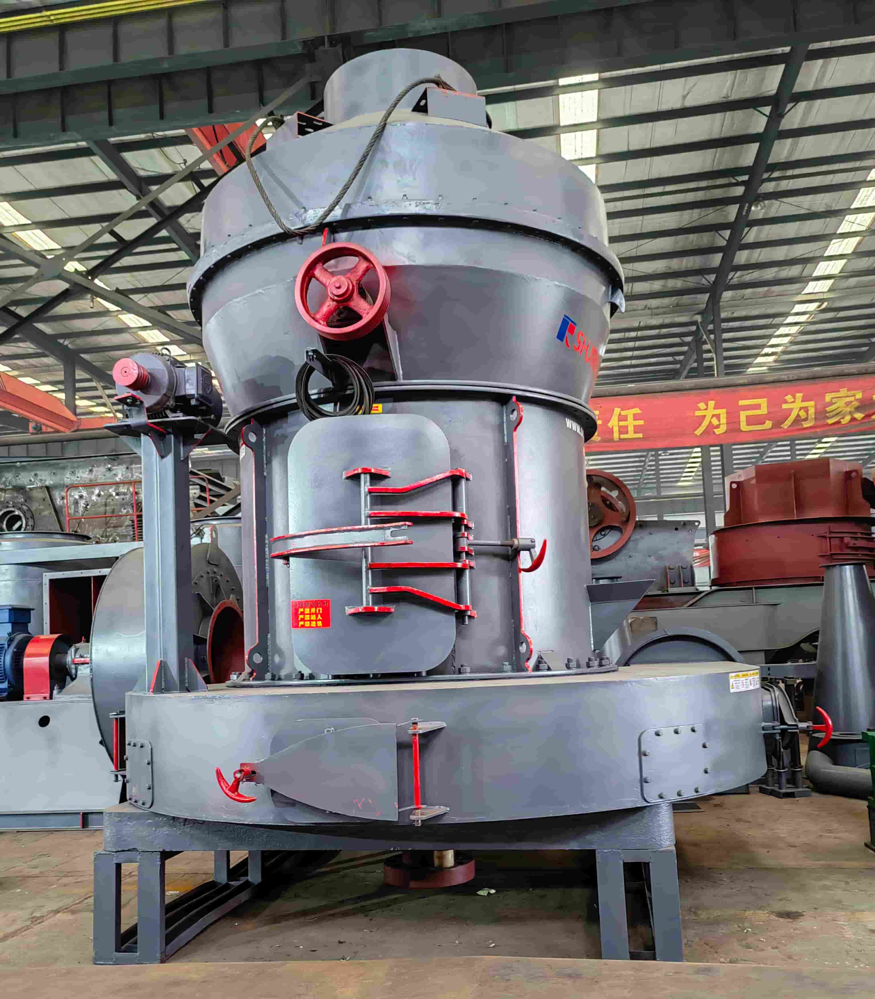 主机工作过程是通过传动装置带动中心轴转动,轴的上端连接着梅花架,架上装有磨辊装置并形成摆动支点,其不仅围绕中心回转,同时磨辊围绕着磨环公转的同时,磨辊本身因摩擦作用而自转。梅花架下端装有铲刀系统,其位置处于磨辊下端,铲刀与磨辊同转过程中把物料铲抛喂入磨辊环之间,形成垫料层,该料层受磨辊旋转产生向外的离心力(即挤压力)将物料碾碎,即由此达到制粉目的。