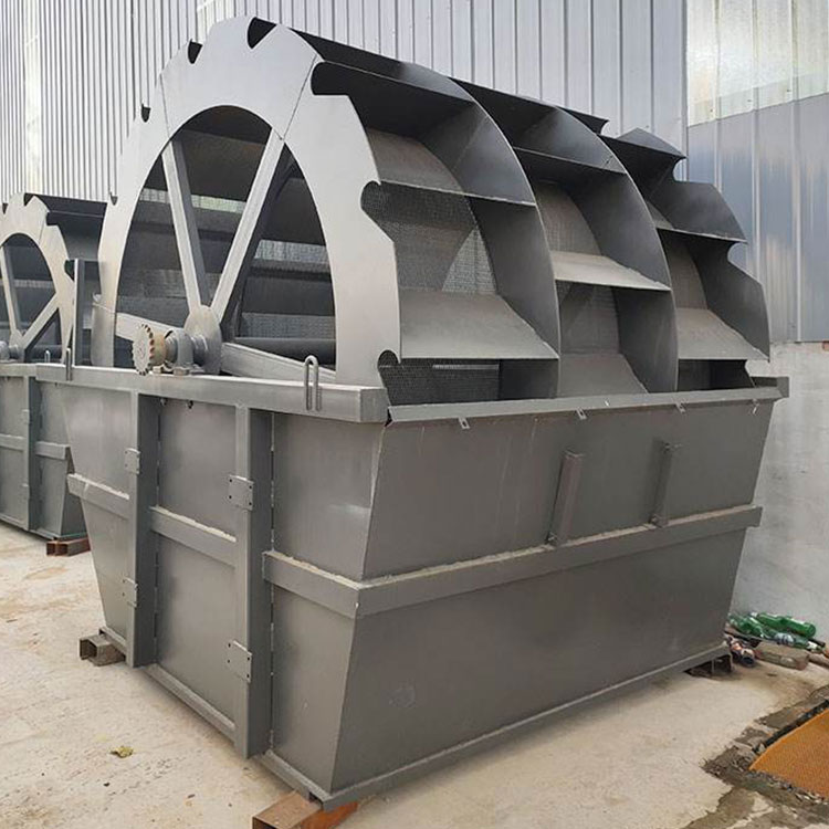 工作时,电机通过三角带、减速机、齿轮减速后带动叶轮缓慢转动,砂石有给料槽进入洗槽中,在叶轮的带动下翻滚,并互相研磨,除去覆盖砂石表面的杂质,同时破坏包覆砂粒的水汽层,以利于脱水;同时加水,形成强大水流,及时将杂质及比重小的异物带走,并从溢出口洗槽排出,完成清洗作用。干净的砂石由叶片带走,砂石从旋转的叶轮倒入出料槽,完成砂石的清洗作用。